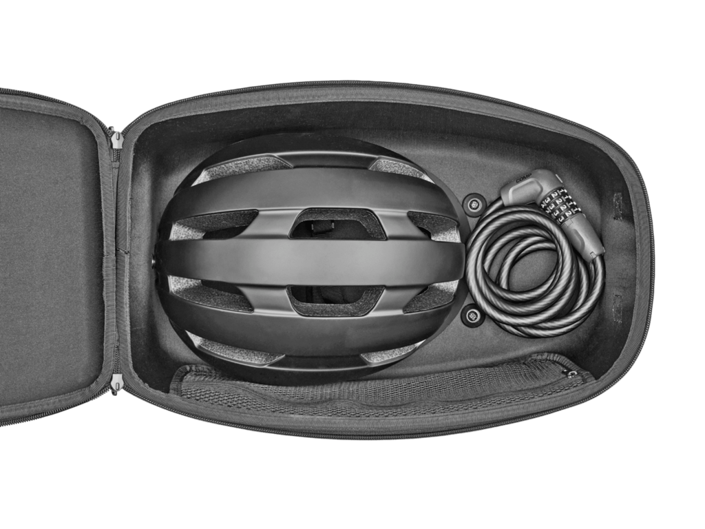Because you can't (well, shouldn't) physically hold stuff while riding, this trunk bag is a solid option. It's water resistant. It has a lockable zipper. Its EVA foam core makes it sturdy.