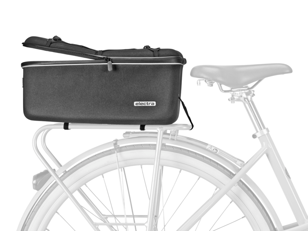 Easily attach to your rear rack via hook and loop straps, or upgrade to an MIK adapter plate for even more convenience. All that's left to do is fill it with your favorite things, which you can easily access thanks to the hinged lid.