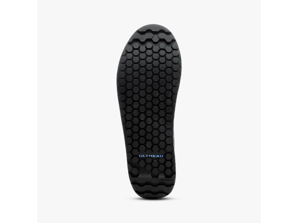 Semelle extérieure en composé de caoutchouc ULTREAD GF collant à rebond lent et zone sous la voûte plantaire plus étendue pour un meilleur contact entre la chaussure et la pédale. Le motif hexagonal permet une stabilité multidirectionnelle et un bon contact avec les ergots, pour contrôler le vélo en toute confiance. Lorsque vous descendez de vélo, les blocs de traction au niveau du talon et des orteils vous maintiennent stable sur les sentiers glissants.