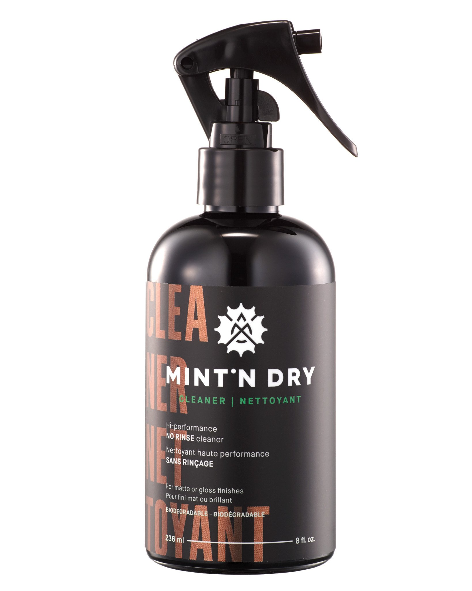 Grâce à sa technologie innovante, le nettoyant MINT’N DRY humecte la surface pour soulever la saleté, sans danger pour tout type de matériau sur votre vélo: fibre de carbone, métal, alliage, plastique et caoutchouc. Il suffit de vaporiser et d’essuyer. Sans rinçage, il élimine la corvée du séchage et les risques d’endommager la mécanique.