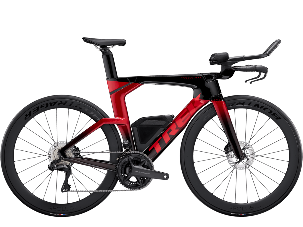 Cadre en carbone OCLV Série 800 ultraléger, tubes Kammtail Virtual Foil (KVF) aérodynamiques, fourche Speed Concept tout carbone, technologie IsoSpeed pour le confort, rangement intégré pour alimentation, boissons et kit anti-crevaison, transmission électronique sans fil Shimano Ultegra Di2 12 vitesses, ensemble potence/cintre entièrement intégré, selle Bontrager Hilo Comp spéciale triathlon, pour une position aérodynamique, freins à disque pour une puissance de freinage garantie et roues Bontrager Aeolus Pro 51 en carbone OCLV.